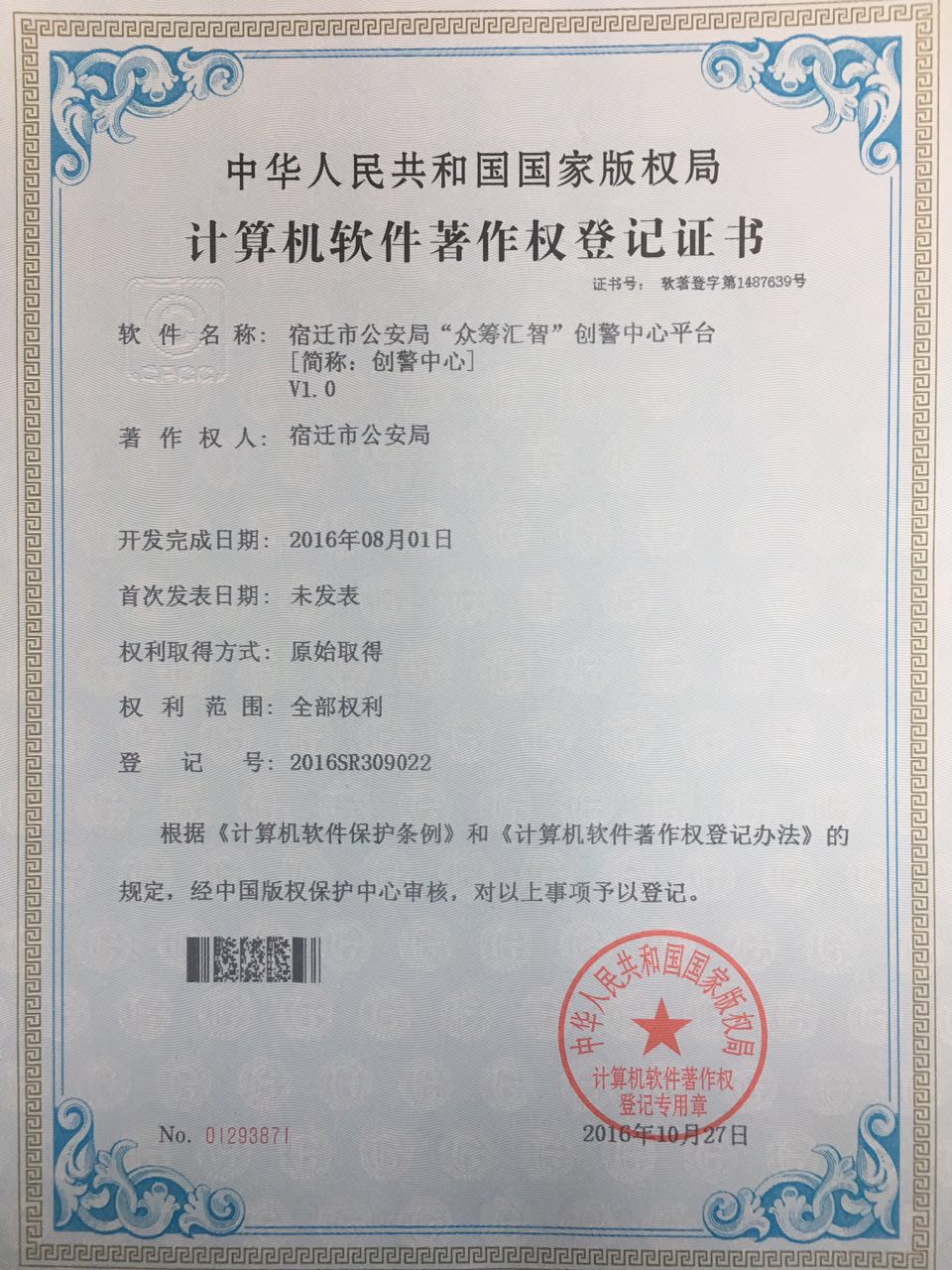 近日,由我司同宿遷市公安局自主研發(fā)的宿遷市公安局“眾籌匯智”創(chuàng)警中心平臺(tái)成功獲得軟件著作權(quán)登記證書。 市局研發(fā)的創(chuàng)警中心平臺(tái)為國(guó)內(nèi)首次發(fā)布,系市局首個(gè)自主開(kāi)發(fā)、擁有自主版權(quán)的計(jì)算機(jī)軟件。此次軟件著作權(quán)的取得,對(duì)外展示了我...